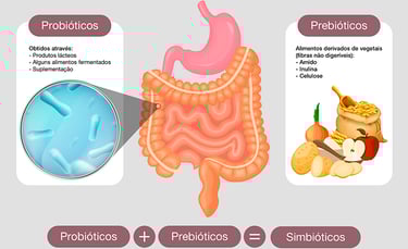 Probióticos e prebióticos que trabalham de forma sinérgica para melhorar a saúde intestinal. Enquanto os probióticos são microrganismos vivos que oferecem benefícios à saúde quando consumidos em quantidades adequadas, e os prebióticos são substâncias não digeríveis que alimentam as bactérias boas no intestino, os simbióticos combinam ambos para potencializar os efeitos benéficos para o sistema digestivo e para o organismo de maneira gera